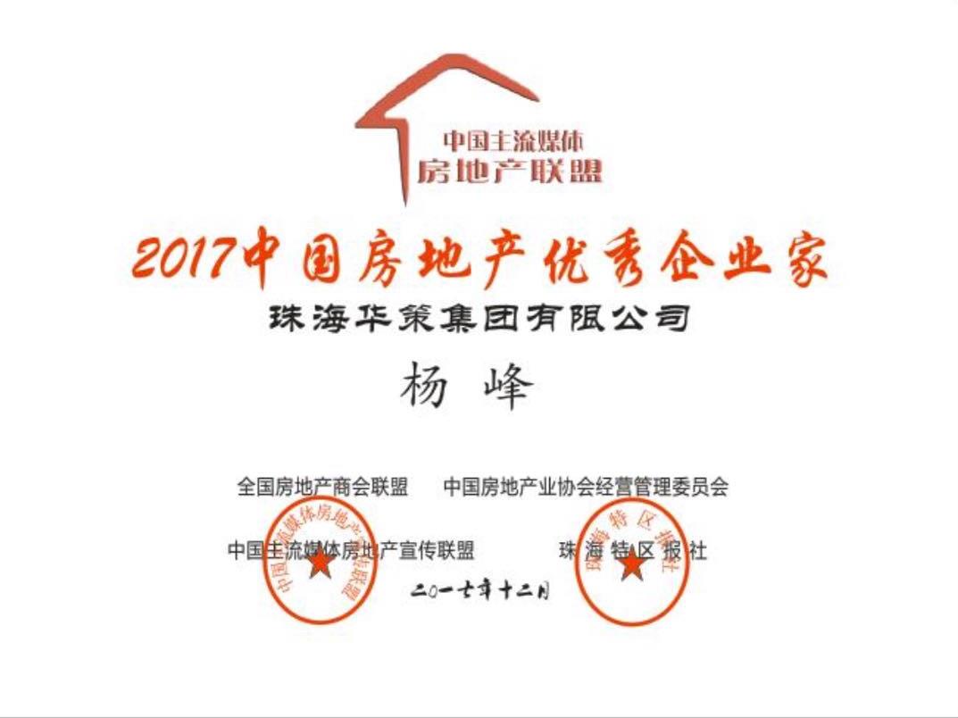 與此同時,珠海華策集團有限公司董事局主席楊峰榮獲2017中國房地產優秀企業家、珠海崇峰房地產開發有限公司董事長助理兼營銷總監逯濤和天慶集團珠海分公司營銷總監何淼榮獲2017中國房地產杰出人物獎項。珠海特區報社地產部副主任、珠海地產職業經理人俱樂部秘書長楊虎獲得2017中國值得尊敬的房地產媒體記者獎項,地產周刊主編陳曉芝獲得2017中國房地產企業優秀企業家征文優秀寫手獎項。